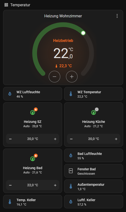 Ebenfalls ist mir aufgefallen, dass die Thermostate in Verbindung mit einem zusätzlichen Wandthermostat deutlich präziser regeln, als wenn sie alleine betrieben werden – in dem Fall heizen sie für meinen Geschmack teilweise etwas stark über das Ziel hinaus, vermutlich weil die Thermostatlogik davon ausgeht, dass die tatsächliche Temperatur im Raum niedriger ist, als die am Heizkörper gemessene. Dem kann man selbstverständlich über einen Offset gegensteuern, allerdings beeinflusst der auch die angezeigten Temperaturwerte am Thermostat in Home Assistant, wodurch diese dann deutlich zu hoch liegen – das ist aber eher ein Schönheitsfehler.