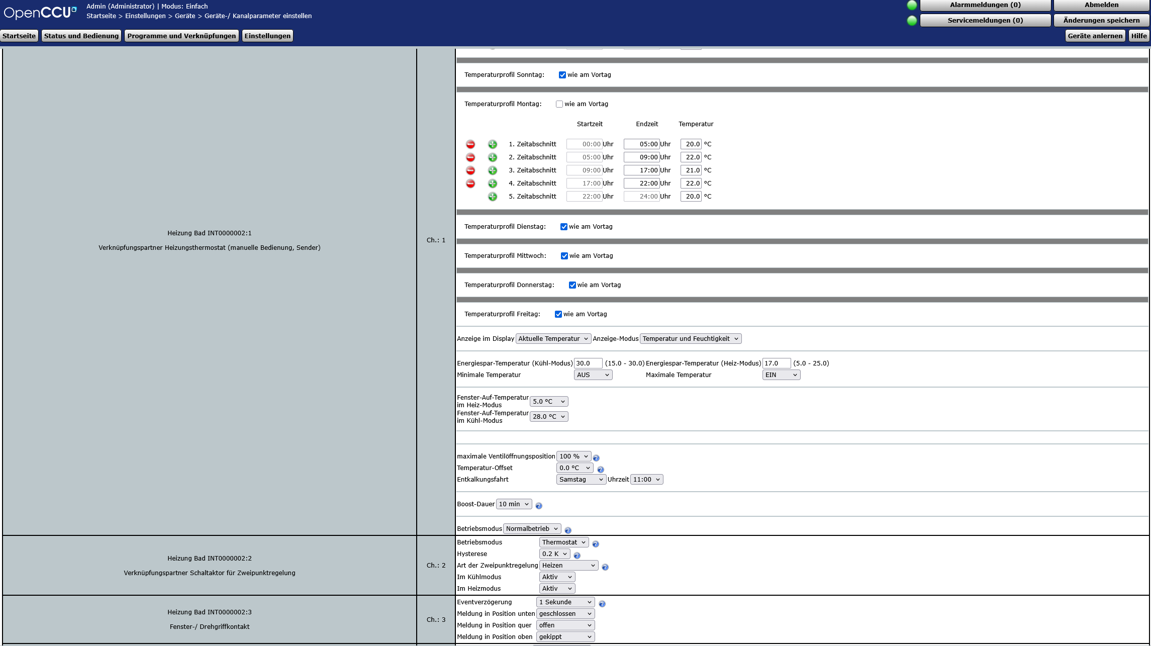 Grundsätzlich könntet ihr nun in HomeAssistant die Geräte direkt ansprechen, allerdings empfehle ich, Zeitpläne stattdessen in der OpenCCU einzurichten. Das hat den Vorteil, dass die Regelung selbst lokal auf den Geräten läuft – für den Fall, dass mit eurem HomeAssistant-Rechner mal etwas nicht funktionieren sollte, läuft die Heizungssteuerung also anhand des zuletzt aktivem Zeitplan einfach weiter. Die Einstellungen je Thermostat könnt ihr in OpenCCU einfach unter Einstellungen > Geräte einrichten. Wenn ihr mehrere Homematic IP Geräte in einem Raum verwenden wollt (seien es mehrere Thermostate, ein zusätzliches Wandthermostat oder Fenstersensoren) empfiehlt es sich, diese über eine Heizungsgruppe in OpenCCU zu verknüpfen. Die so verknüpften Geräte kommunizieren anschließend nicht nur über die CCU miteinander, sondern auch direkt, sodass auch ohne CCU die Wandthermostate und Fenstersensoren weiter die Heizung beeinflussen können. Eine Gruppe legt ihr unter Einstellungen > Gruppe an.